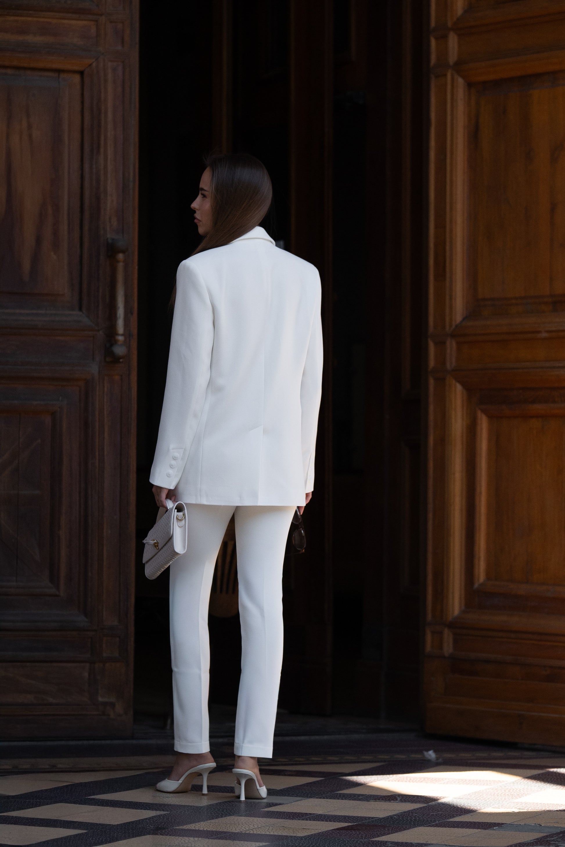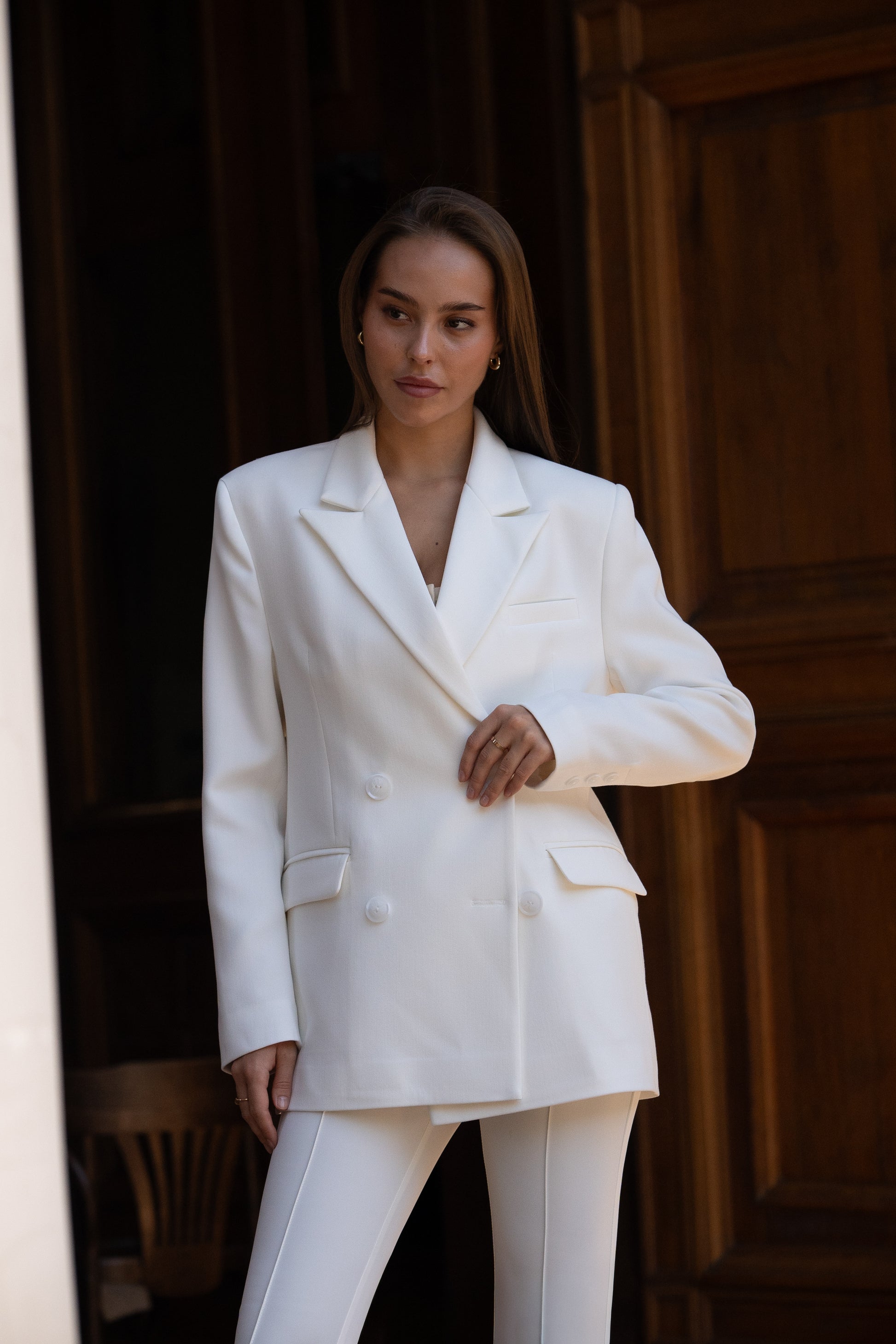 Двобортний піджак із чіткою лінією плеча та брюки звуженого крою формують ідеальний силует, що легко інтегрується у будь-які образи.