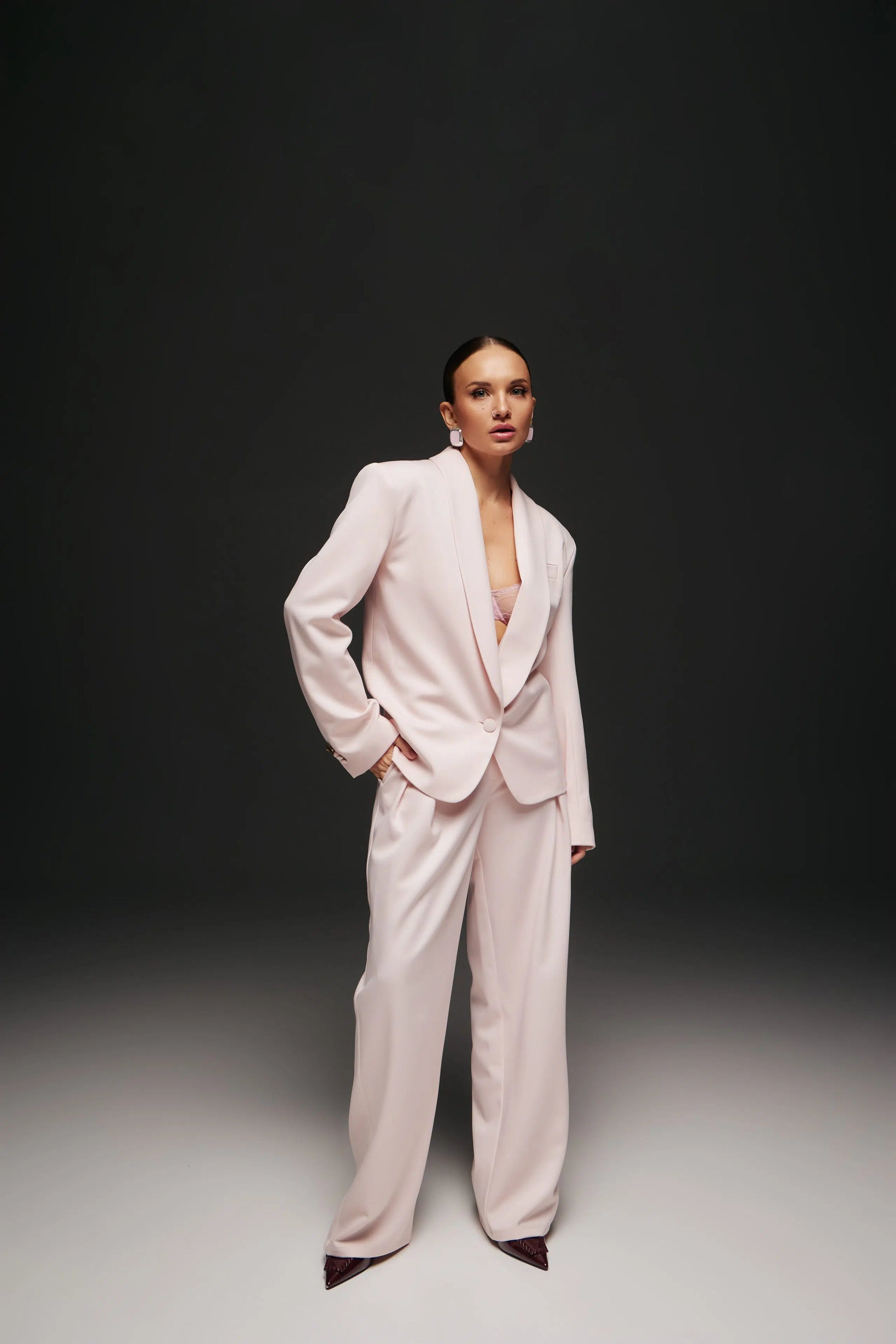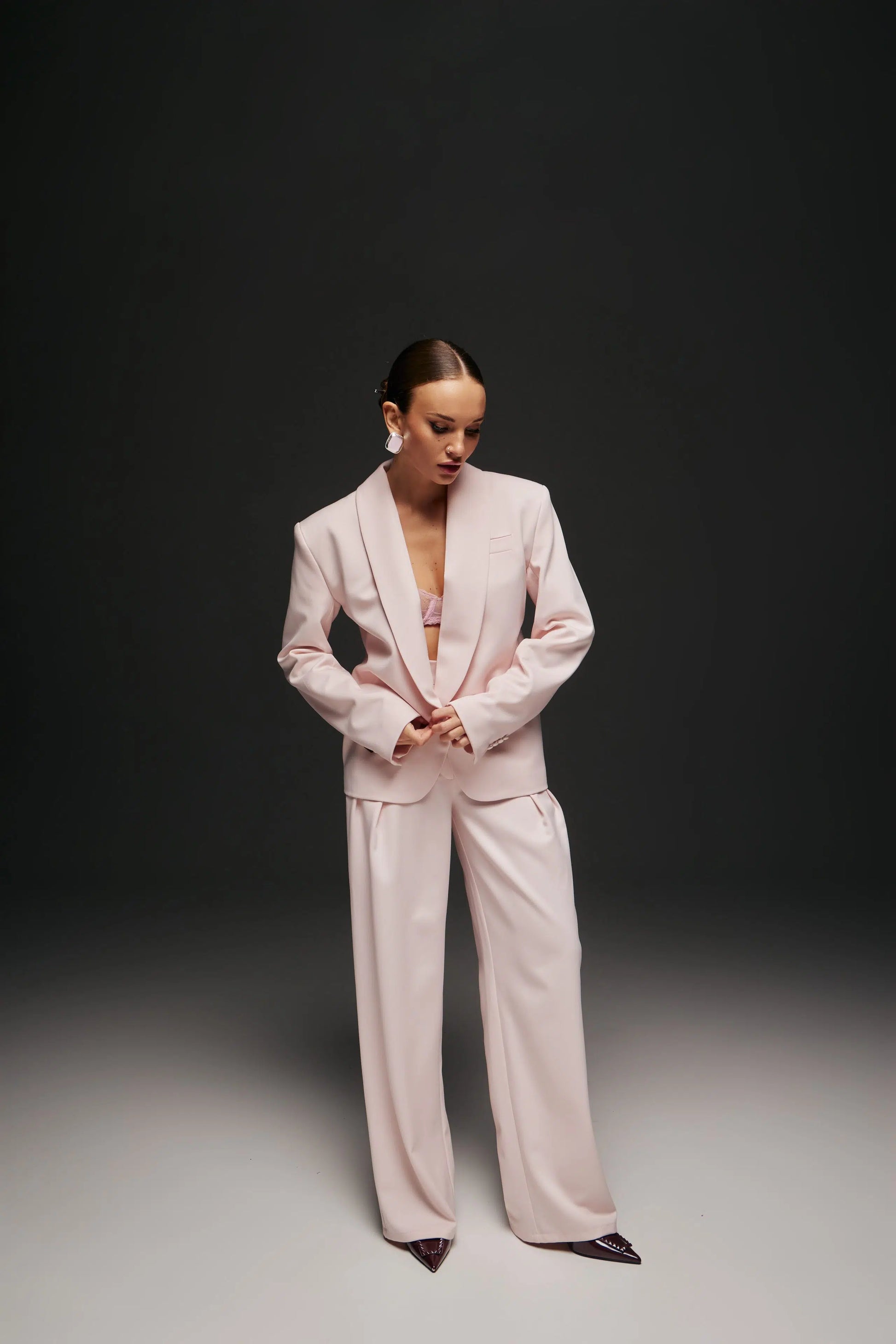 Штани прямого крою з витонченими складками, що гармонійно доповнюють жакет і формують завершений силует.