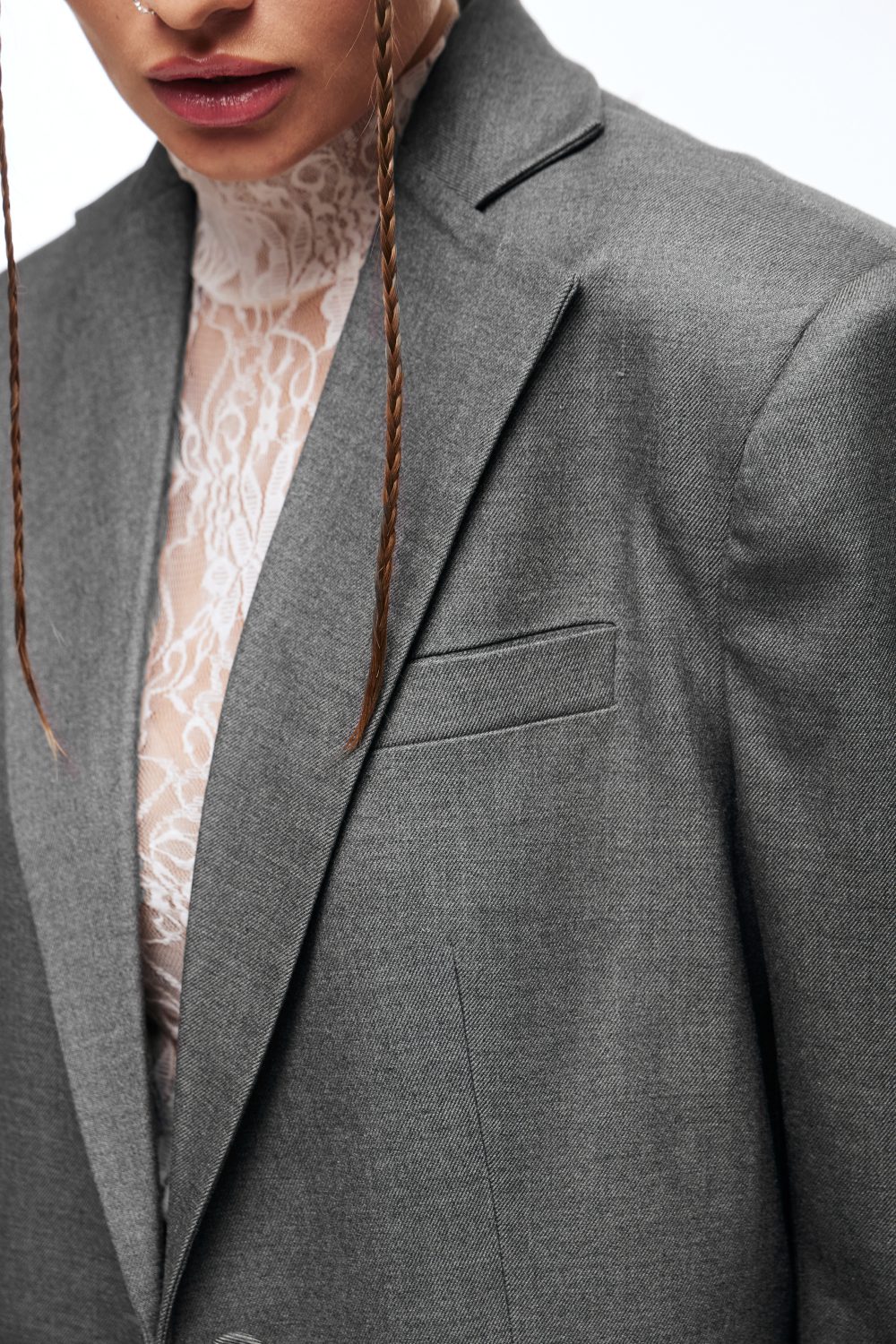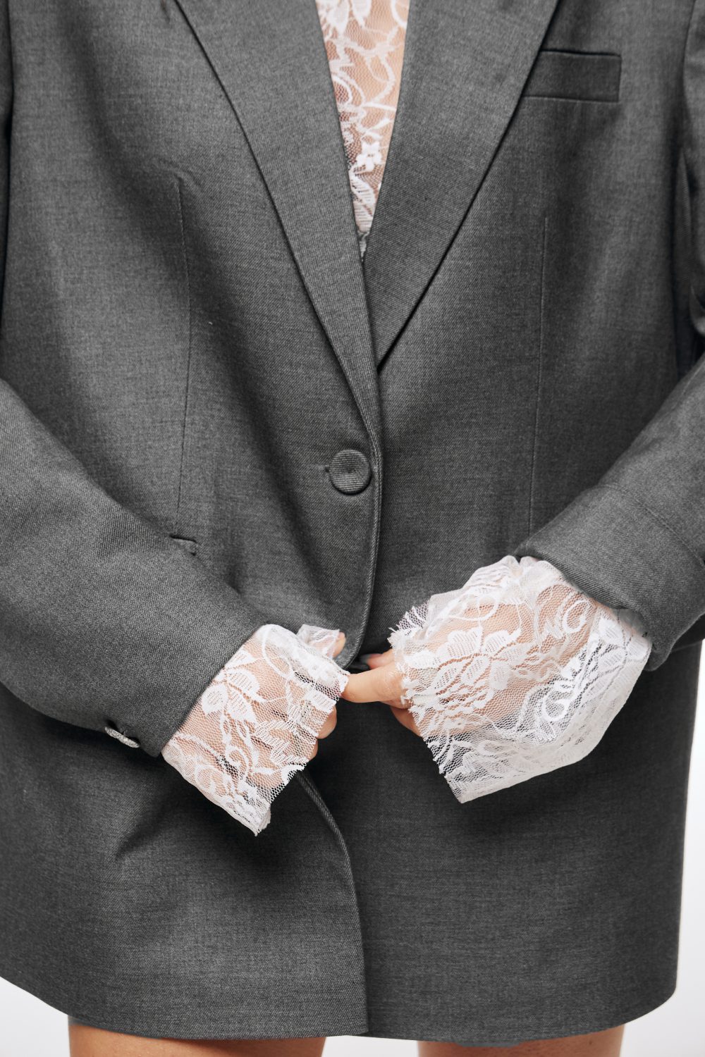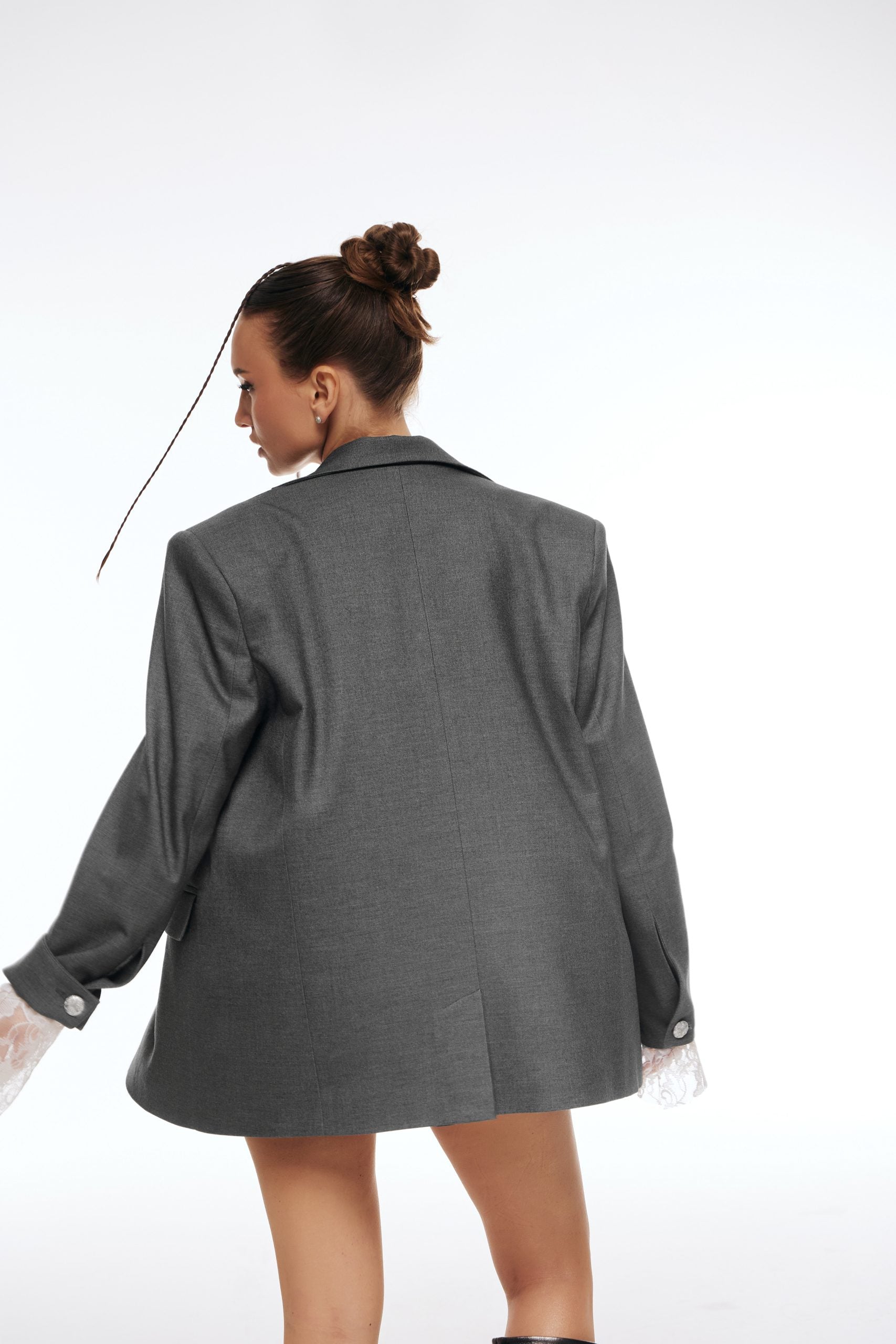 Жакет оверсайз крою у глибокому, насиченому сірому кольорі. Цей виріб — поєднання комфорту та романтики.