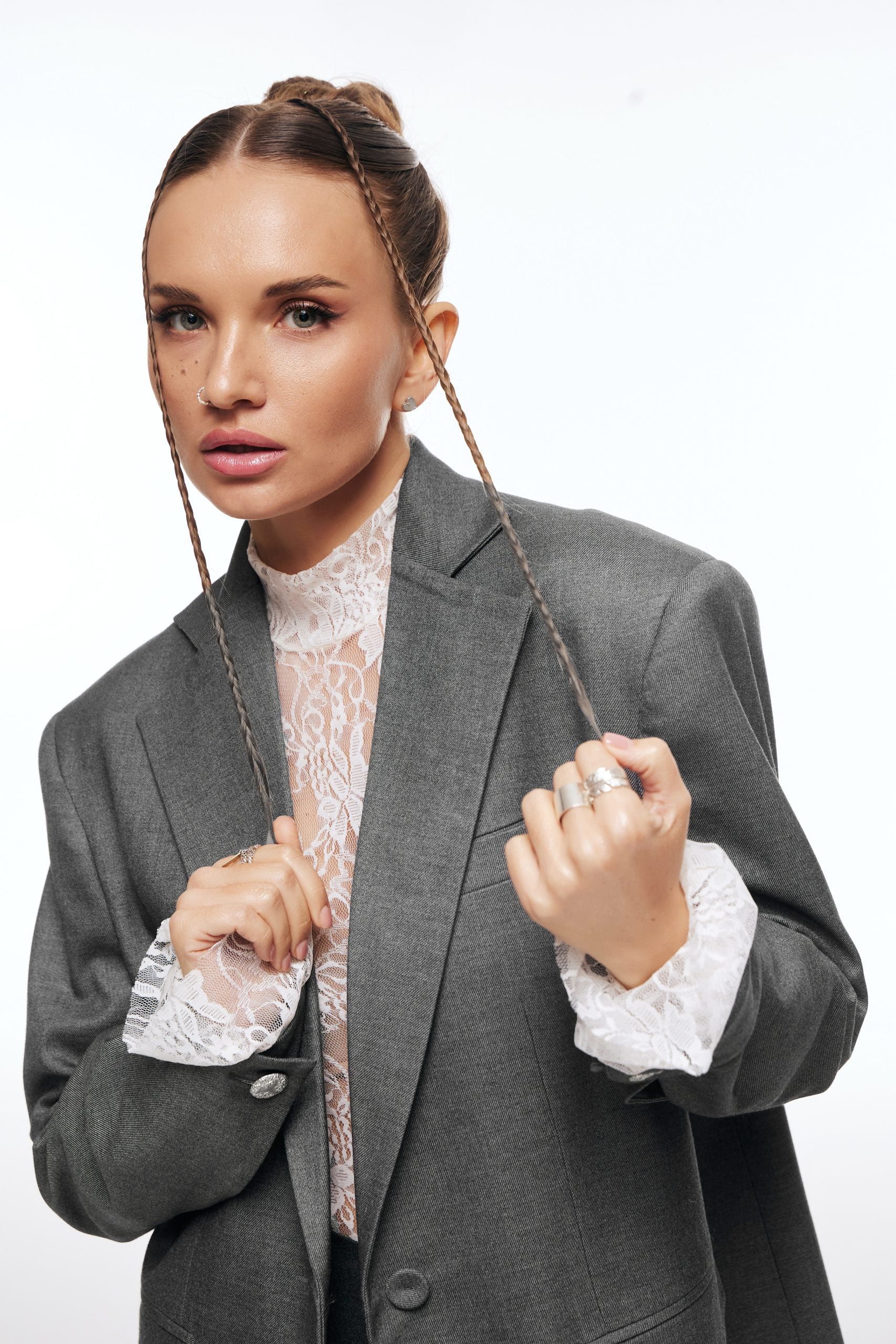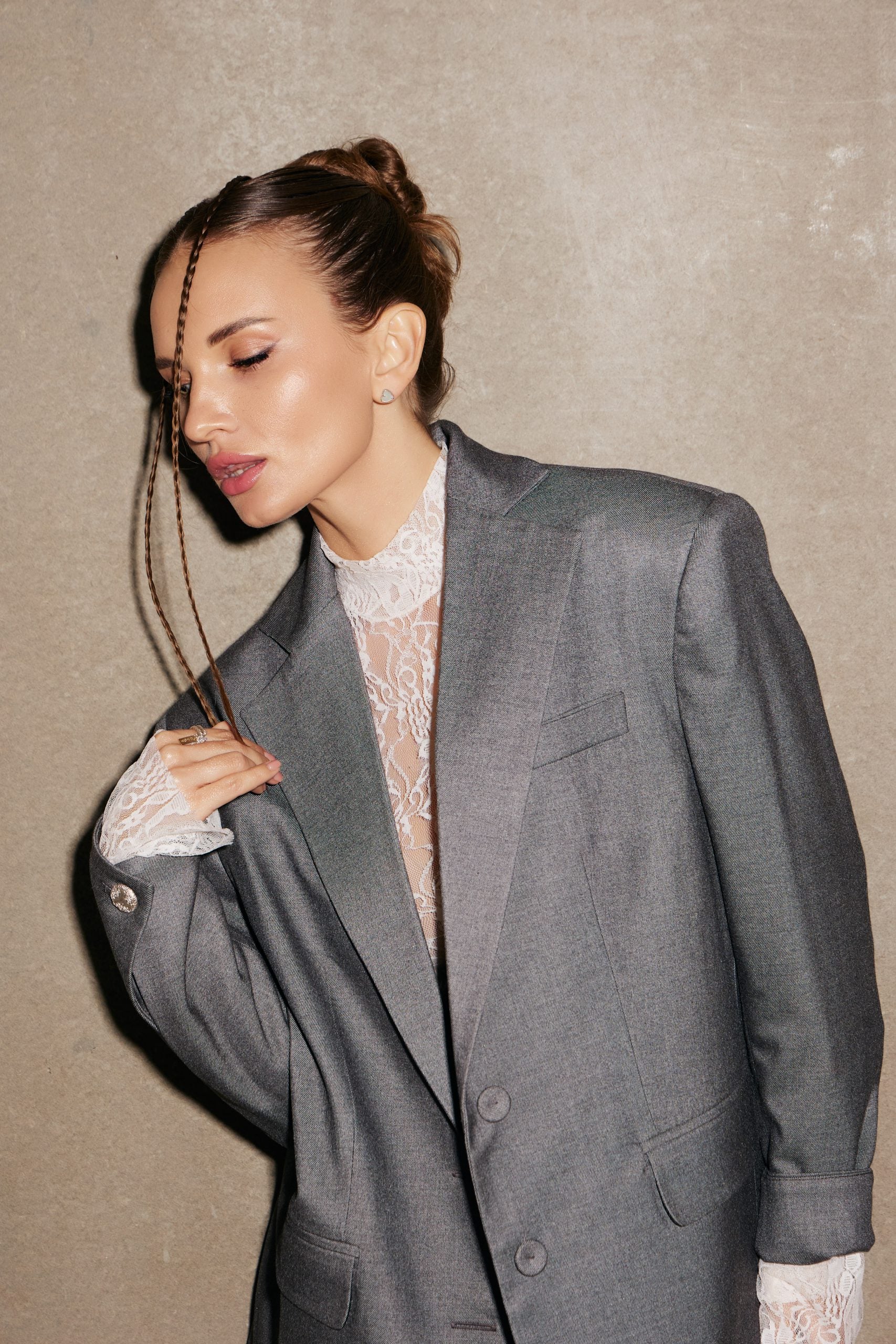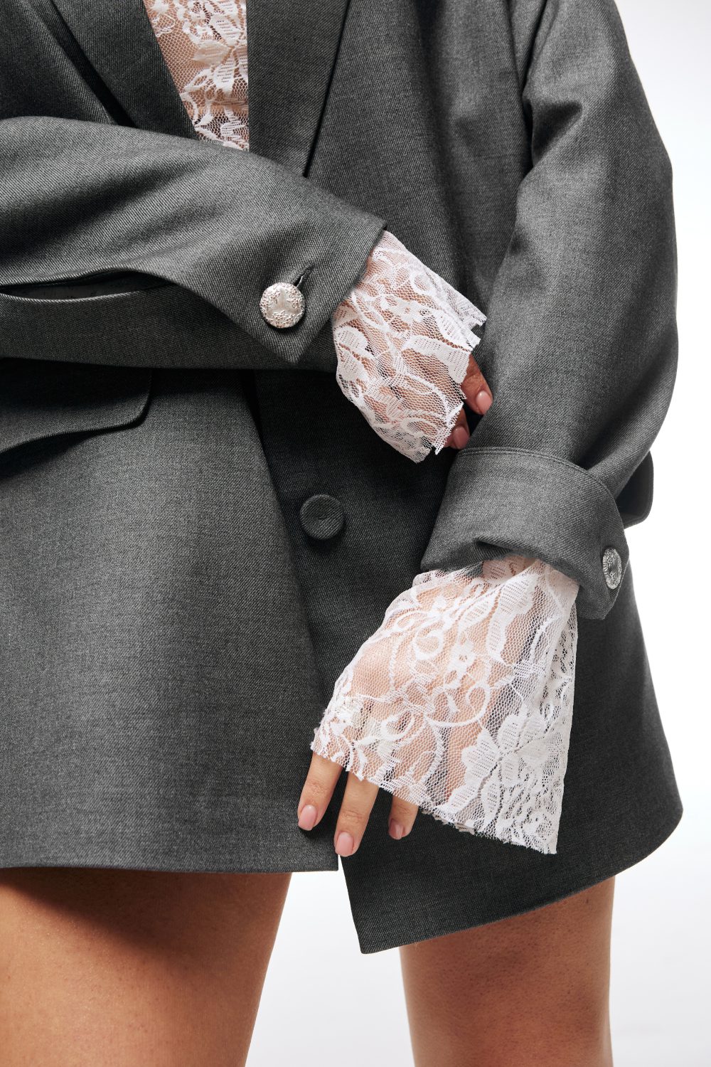 Жакет оверсайз крою у глибокому, насиченому сірому кольорі. Цей виріб — поєднання комфорту та романтики.