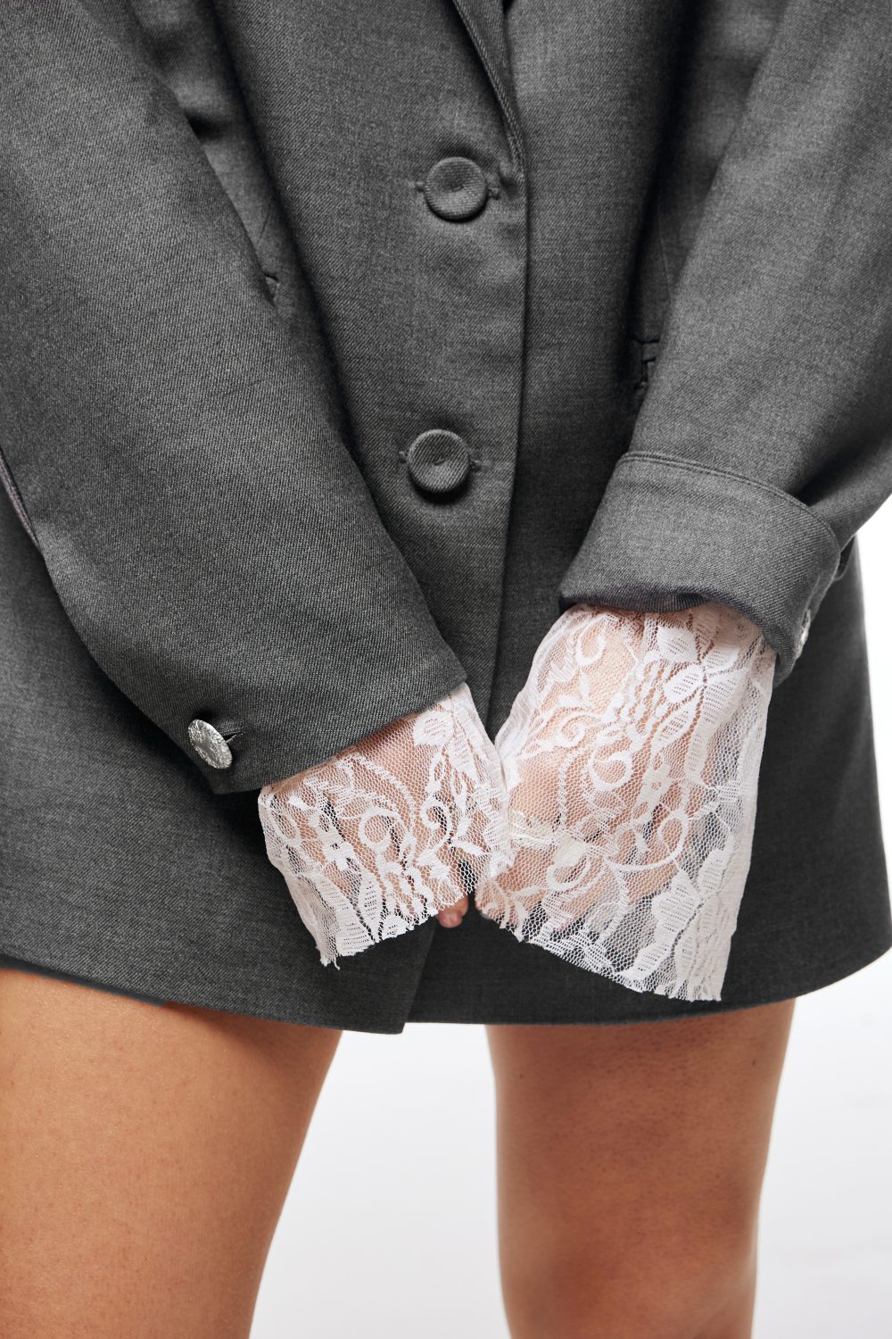 Рукави елегантно оздоблені вишуканим мереживом. А на спинці ми обіграли брючну кишеню.
