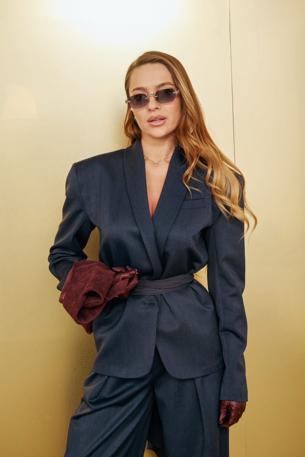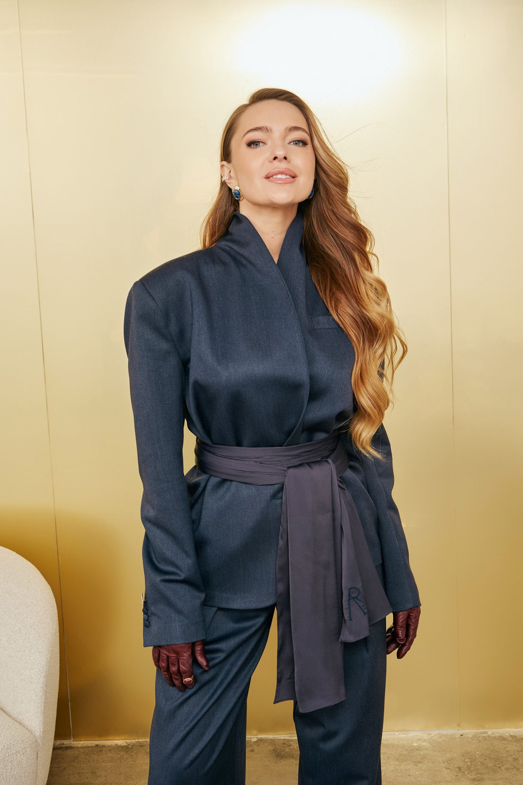 Довгий лацкан додає образу вишуканості, а оздоблення виконане з особливою увагою до деталей: фурнітура обшита в тон, а на рукаві – акцентний ґудзик з рожевим камінцем (або золотим).