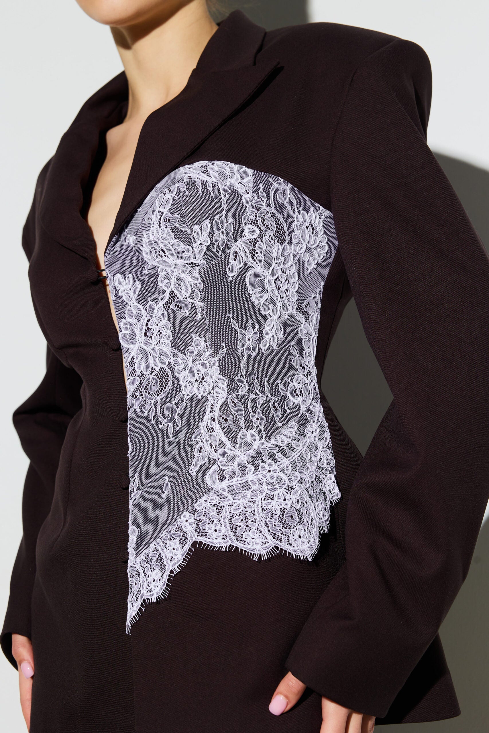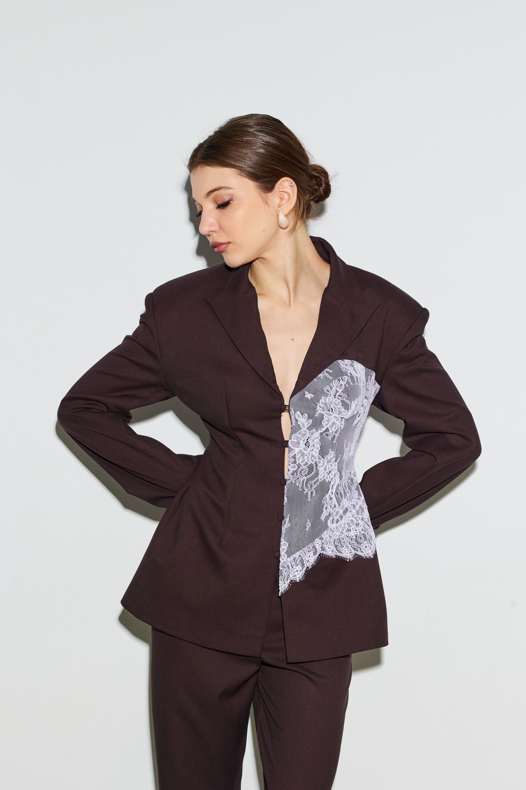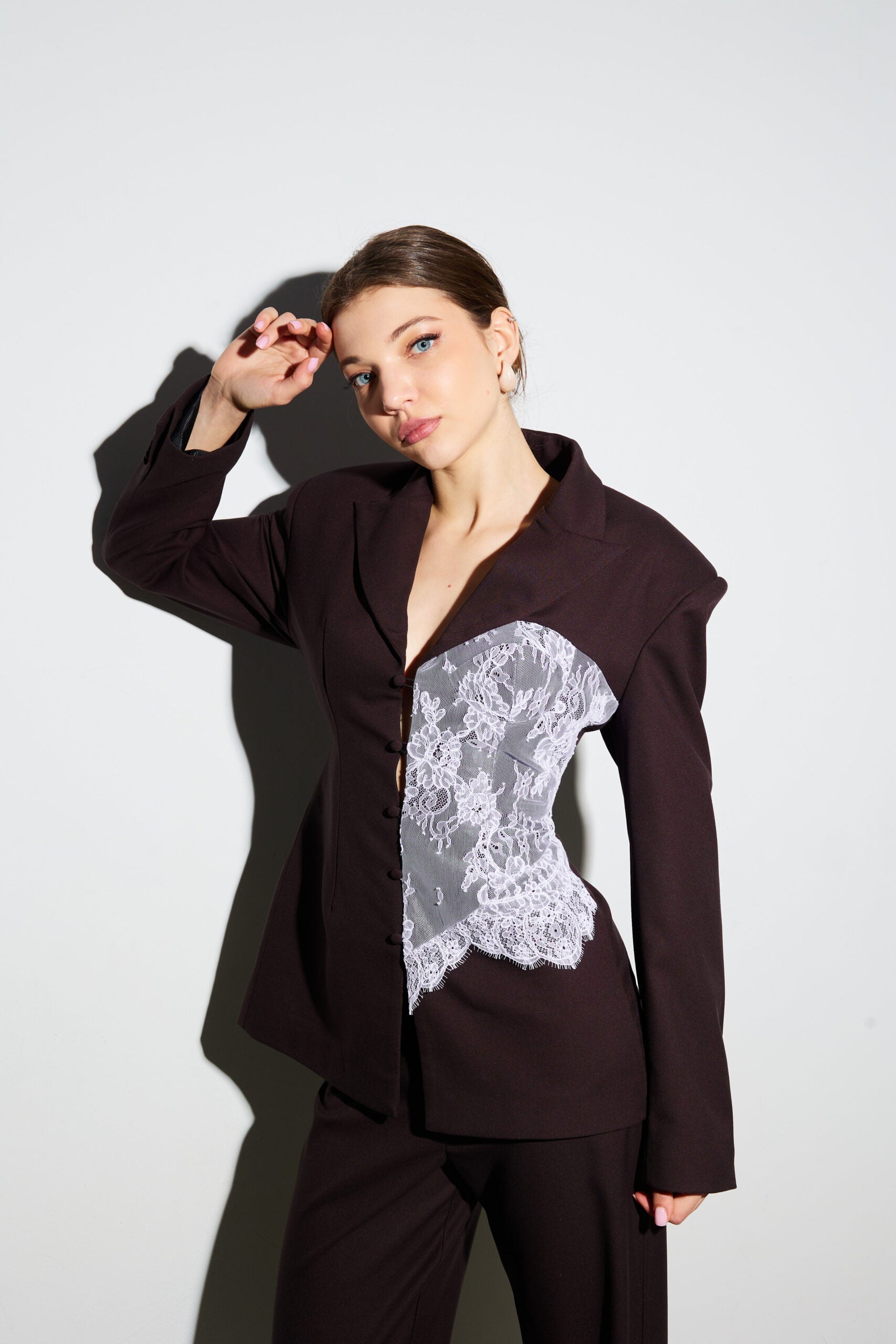 Приталений жакет з акцентними плечима та корсетною затяжкою на спинці, створює красивий силует фігури та має цікаву деталь, виконану з мережива.