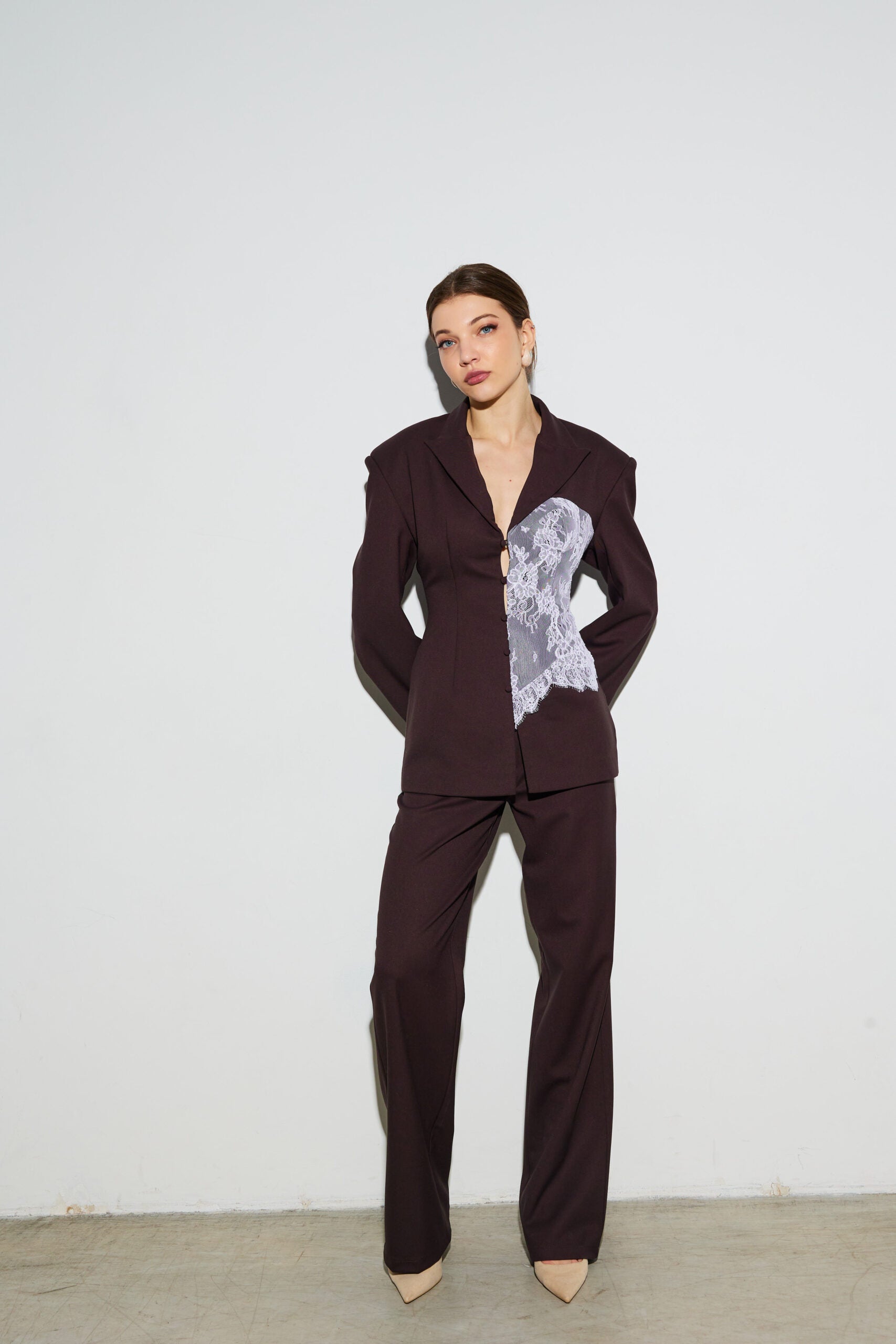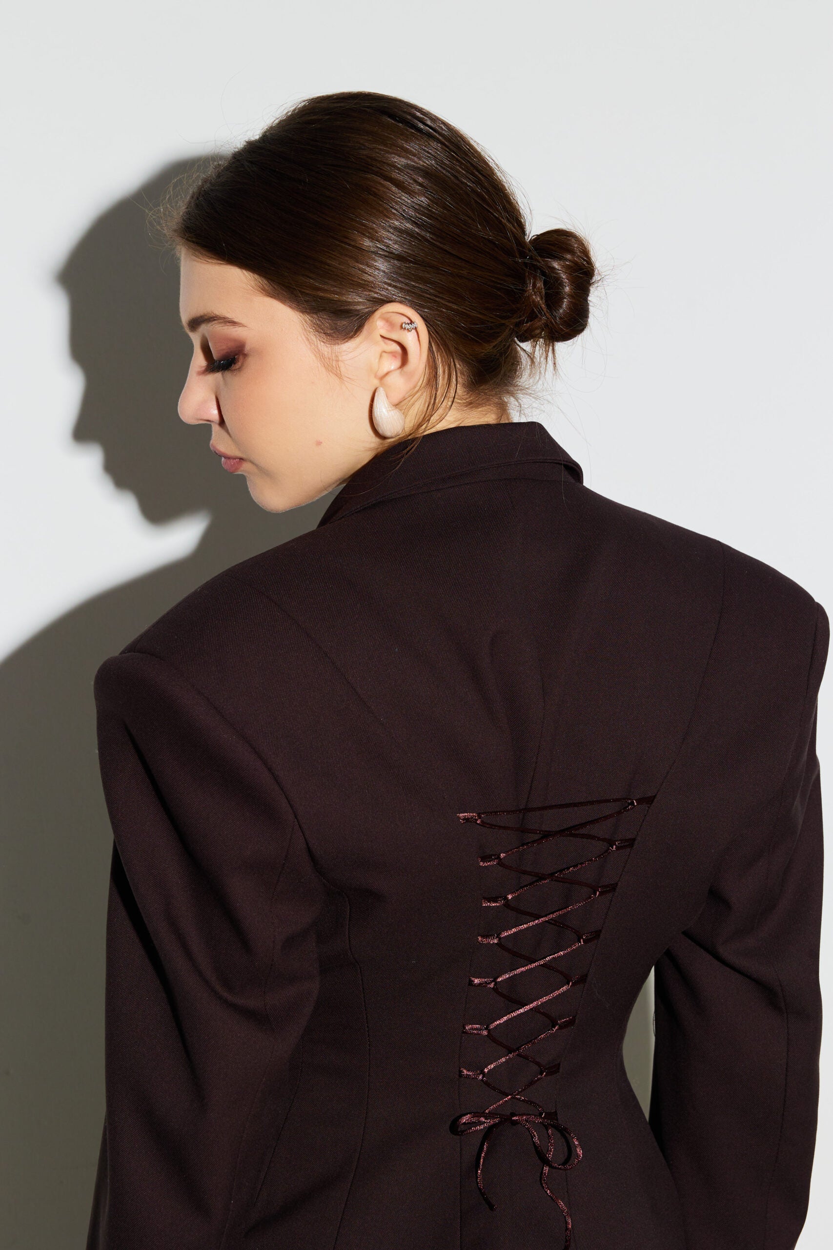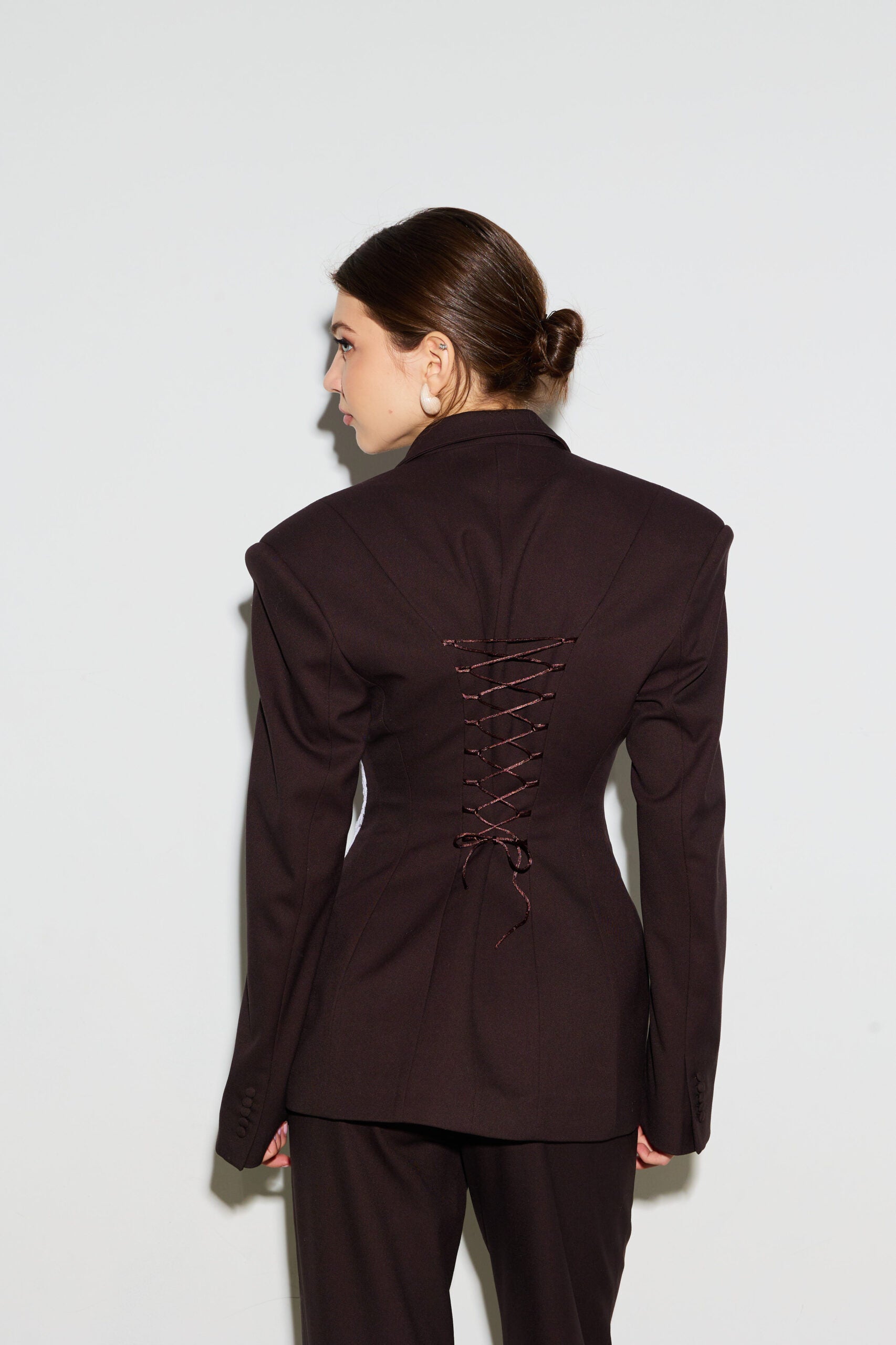 Приталений жакет з акцентними плечима та корсетною затяжкою на спинці, створює красивий силует фігури та має цікаву деталь, виконану з мережива.