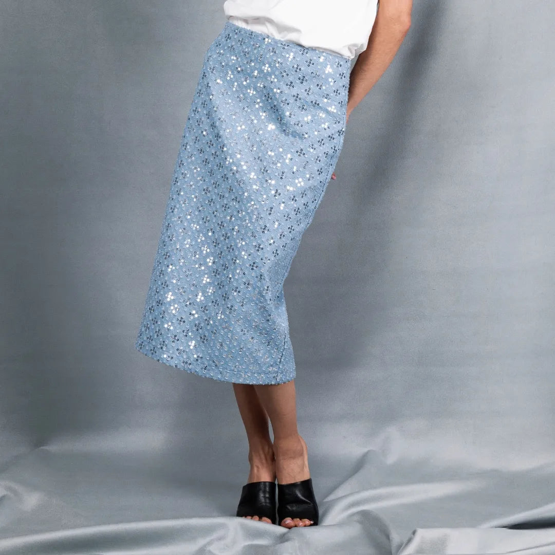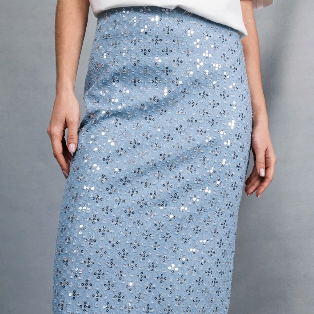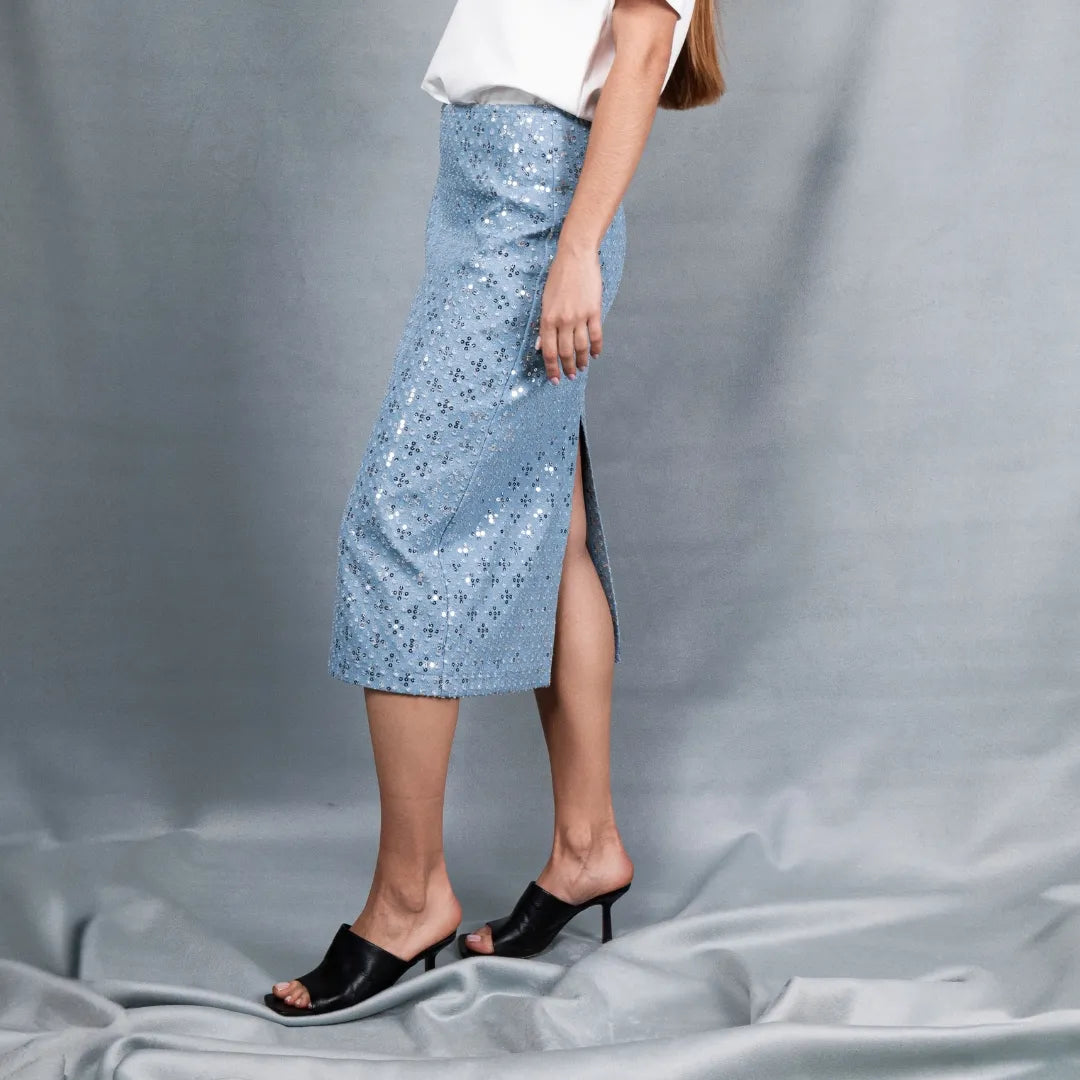 Мідіспідниця зі світло-блакитного джинсу — справжній must-have для весни. Легка тканина всипана дрібними лелітками, які ніжно вловлюють світло при кожному русі, створюючи ефект делікатного мерехтіння. Завдяки класичному крою спідниця легко поєднується як з елегантними блузами чи підборами для вечірнього виходу, так і з базовими футболками для стильних повсякденних луків.