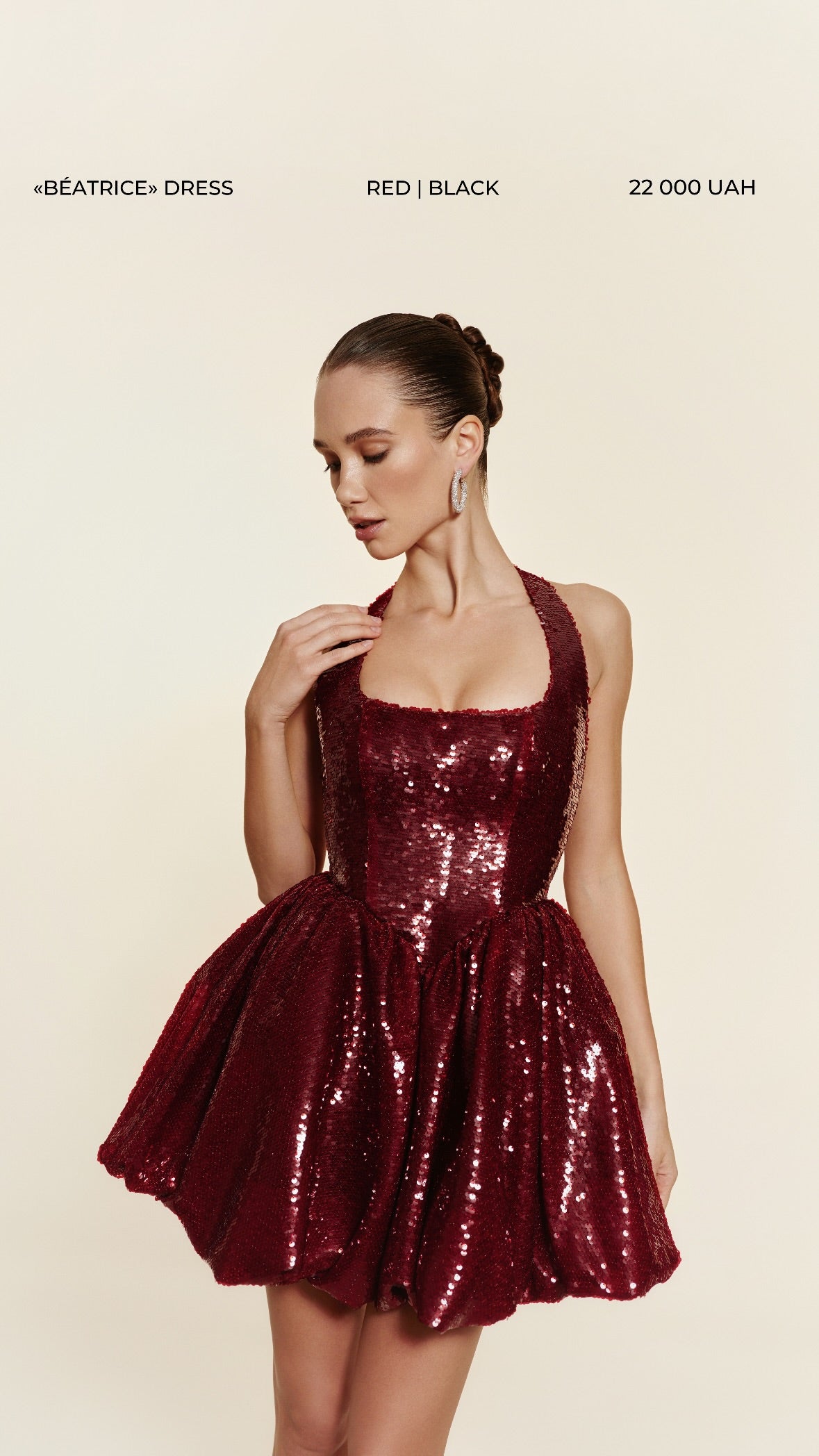 Сукня «Beatricé» у червоному кольорі створена для моментів, коли хочеться запам’ятатися з першого погляду. Повністю виконана з мерехтливих червоних леліток, вона створює глибоку сяючу текстуру, що ловить світло з будь-якого ракурсу.